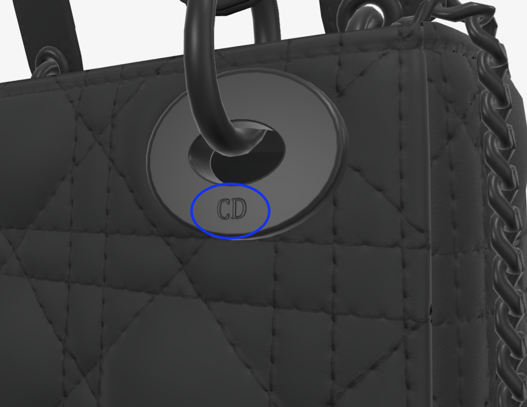 공식홈페이지에 기재된 해당 가방의 각인 텍스트를 보면 [CD]에서 C의 밑부분이 삐침으로 뾰족하게 올라와있는데,