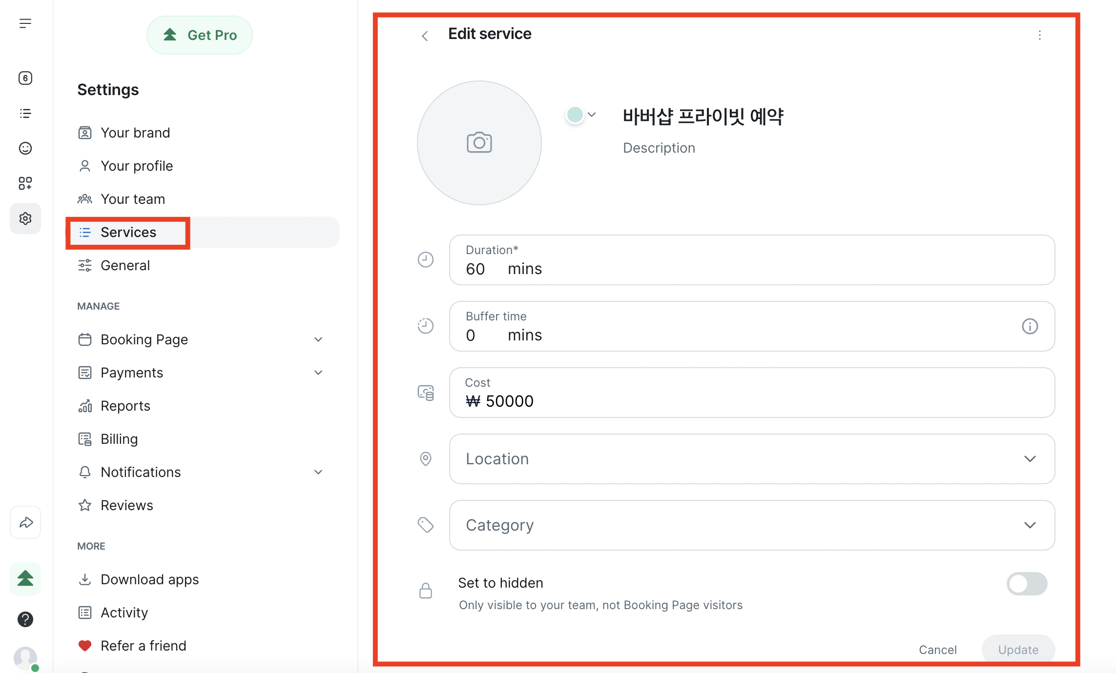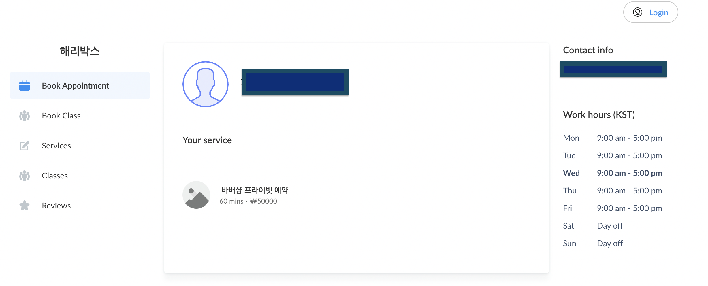 저는 '바버샵 프라이빗 예약'으로 설정했고, 작업기간은 60분, 비용은 5만원으로 설정해보았습니다.
