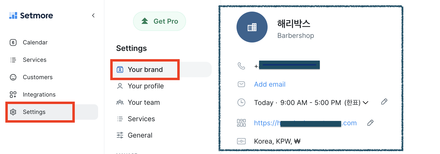 7. 설정을 다하셨다면, [Settings] -> [Your brand] 탭을 클릭하면, 본인의 연락처, 이메일, 그리고 본인의 웹사이트 주소가 나옵니다.