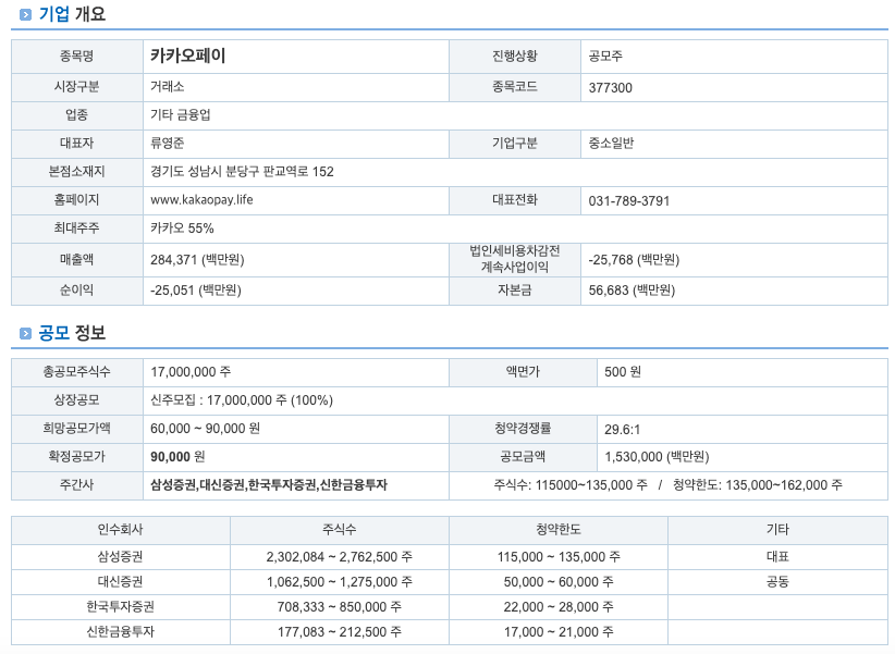 카카오페이는 핀테크 기업으로서 2014년 9월 국내 최초로 간편 결제 서비스를 시작하였고, 이후 송금, 청구서 등 다양한 서비스를 론칭하였습니다. 결제시스템의 탄탄한 시장 지위를 기반으로 대출, 보험, 투자 서비스 등과 같은 금융서비스 중개사업으로도 사업영역을 확장할 계획에 있는 기업입니다.