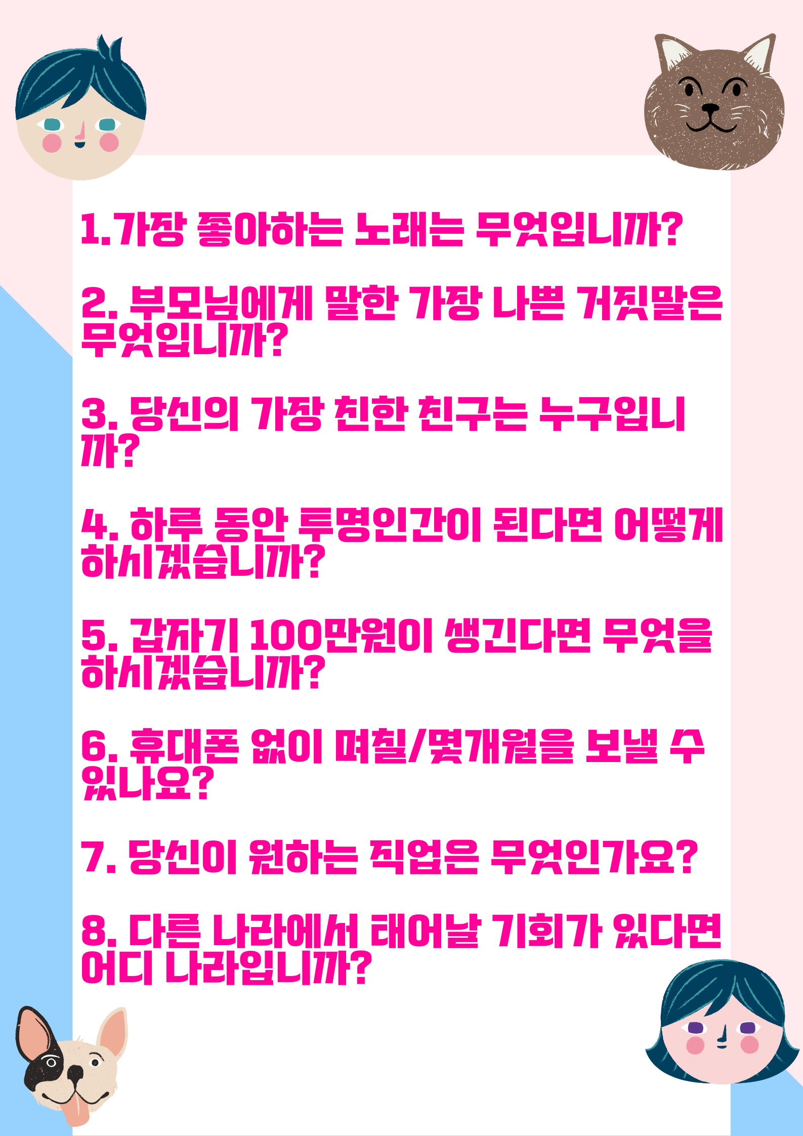 이번 기회를 통해서 친구들의 솔직한 마음과, 평소에는 알지못했던 친구들의 생각을 알 수 있는 좋은 기회가 될 것 같습니다!