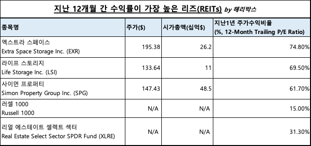 다음은 최근 12월간 수익률이 가장 높은 리츠 목록이다 :