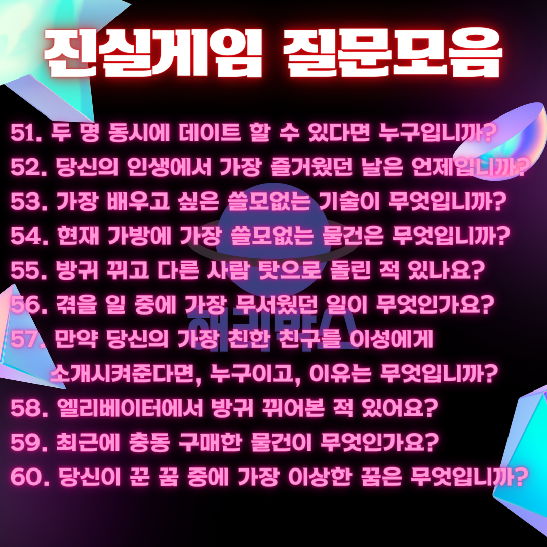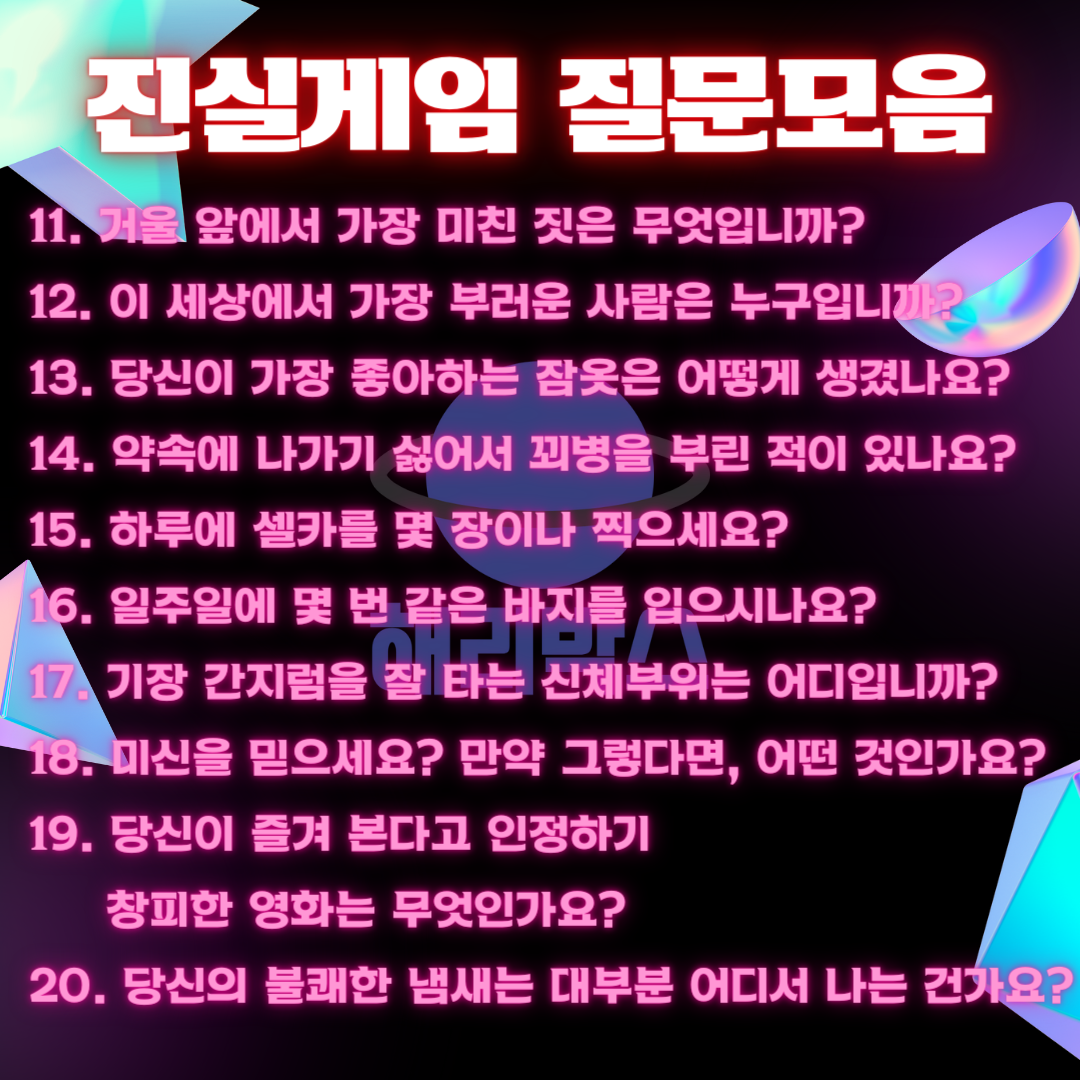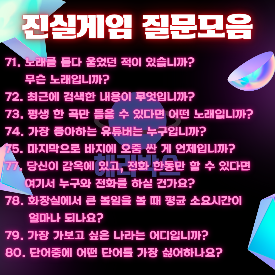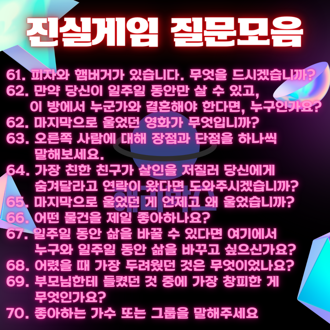 지난번에 올린 진실게임 좋은 질문 콘텐츠에 이어 추가로 업데이트하여 더 방대한 질문들로 준비하였습니다 :)