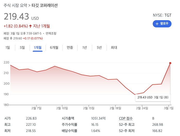 인기 소매 체인 타깃(TGT)의 지난 주가를 살펴보면, 2021년 11월에는 주가가 266달러를 기록하면서 52주 만에 최고치를 달성했다. 하지만 그 이후로 2022년 2월까지 끊임없는 하락세를 보여왔다.