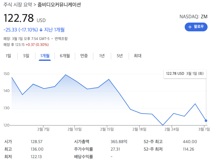 ▣ 줌비디오커뮤니케이션 (Zoom Video Communications Inc.)는 자사의 핵심 플랫폼인 미팅스(Meeting)의 치열한 경쟁과 낮은 가입률로 인해 올해 매출과 수익을 저하시킬 것으로 예측했다.