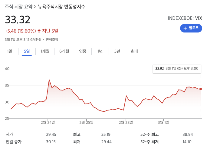 ▣ 월가의 공포 측정기로도 알려진 CBOE 변동성 지수는 2월 24일 이후 최고치로 상승했다.