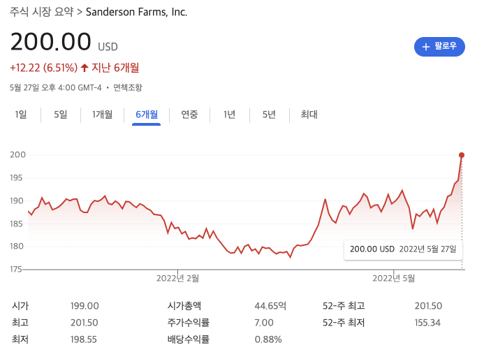 미국판 '하림' 으로 불리며, 가금류 가공 회사인 Sanderson Farms는 신선, 냉동 가공된 닭고기 제품의 유통을 담당하고 있습니다. 샌더슨의 주식은 올해 들어 6% 정도 올랐습니다.