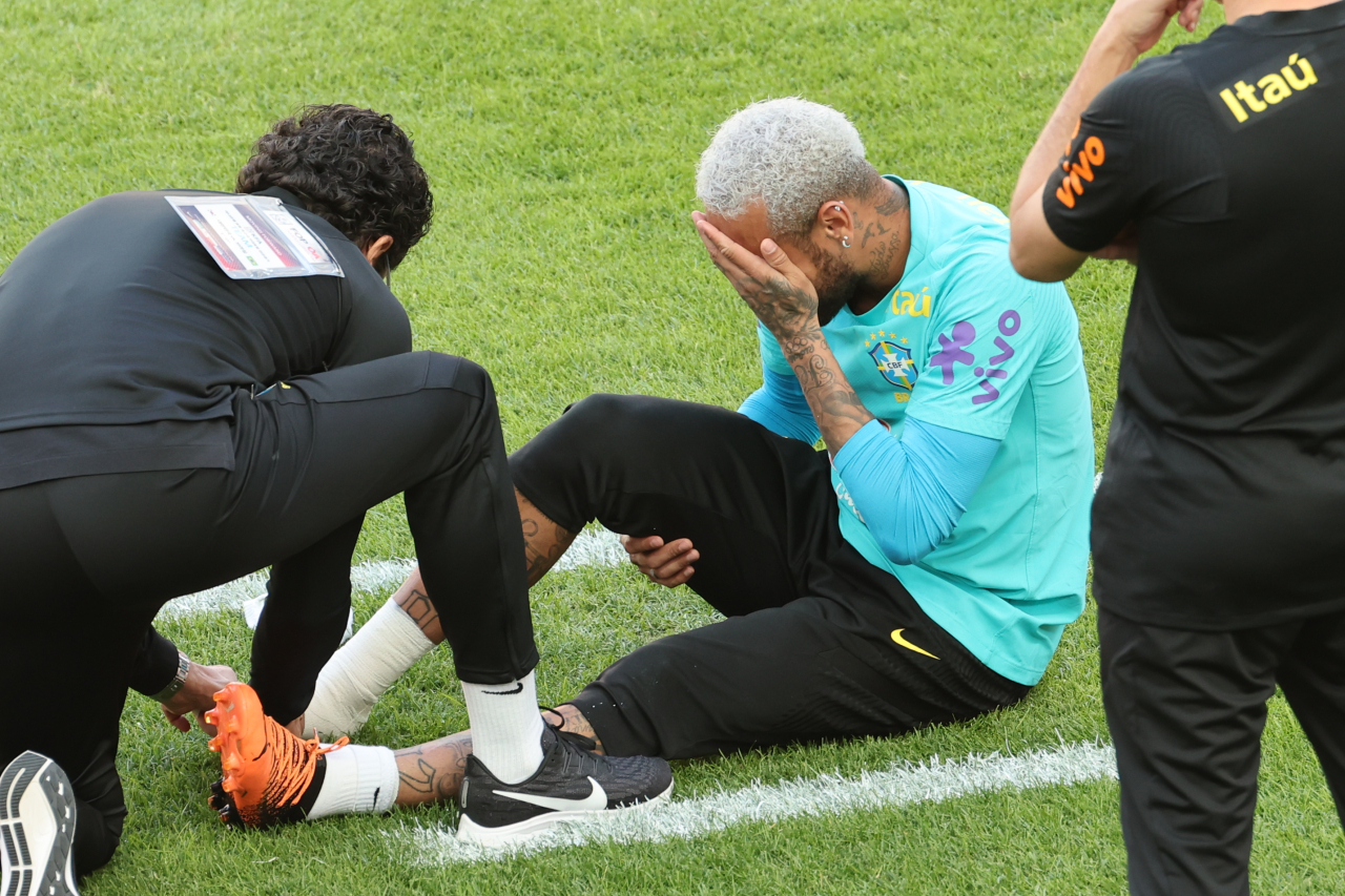 네이마르는 지난 수요일 서울월드컵경기장에서 훈련 도중 동료와 충돌한 뒤 오른발을 움켜쥐고 잔디밭에 쓰러졌습니다