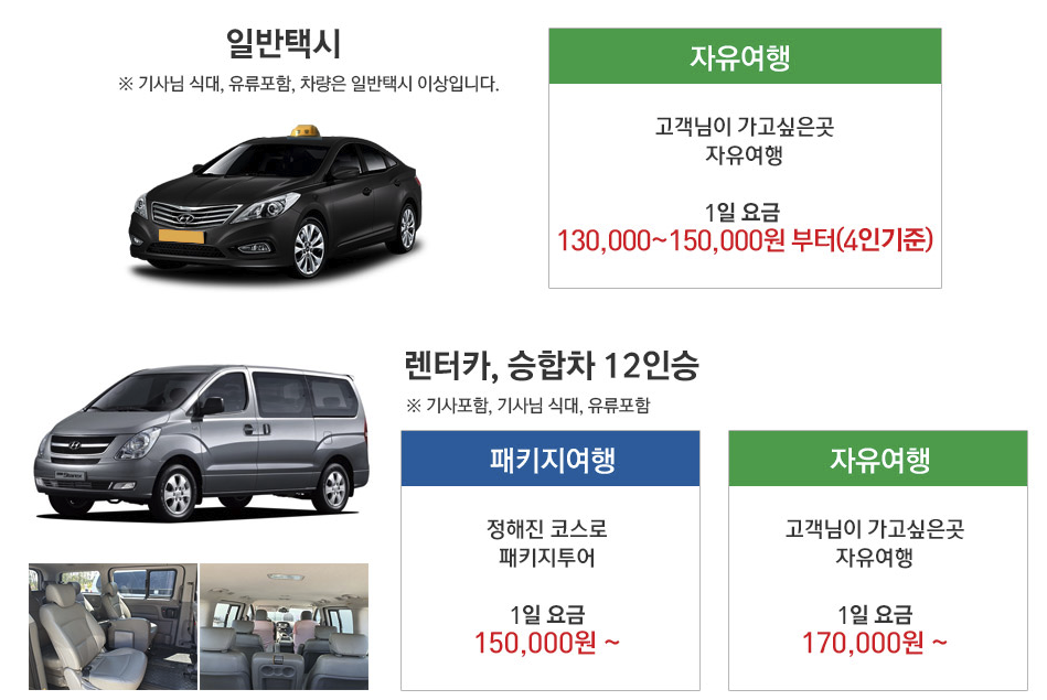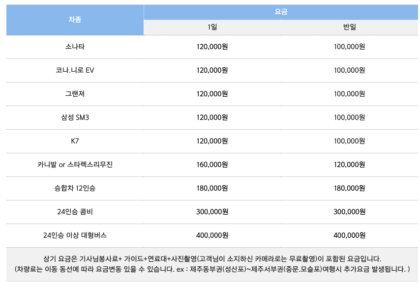 - 차량비 + 연료비 + 봉사료 포함