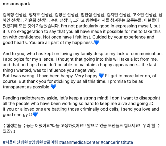 안나씨 인스타그램에 서울아산병원에서 찍은 사진을 공개하면서 암투병과 관련된 내용을 고백했습니다.