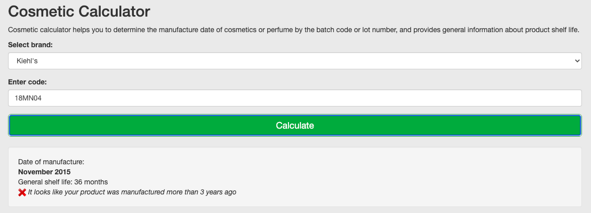 앞서 언급했던 사이트에서 브랜드는 Kiehl's 를 선택했고, 코드는 18RD1U로 입력하여 조회를 해보았다.